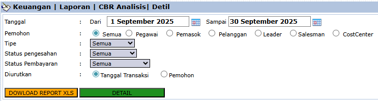 Modul Laporan CBR Analisis berfungsi untuk menghasilkan laporan yang terperinci dari semua Permintaan Buku Kas (Cash Book Request - CBR). Laporan ini adalah alat utama untuk melacak, merekapitulasi, dan menganalisis semua permintaan dana internal (misalnya, untuk kas kecil, klaim reimbursement, dll.) berdasarkan berbagai kriteria.