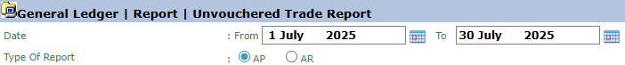 Modul laporan Unvouchered Trade Report berfungsi untuk menghasilkan daftar transaksi yang masih "menggantung" atau belum dibuatkan faktur/tagihan resminya. Laporan ini sangat penting untuk memastikan semua transaksi penjualan ditagih (Piutang/AR) dan semua transaksi pembelian dicatat sebagai hutang (Hutang/AP).